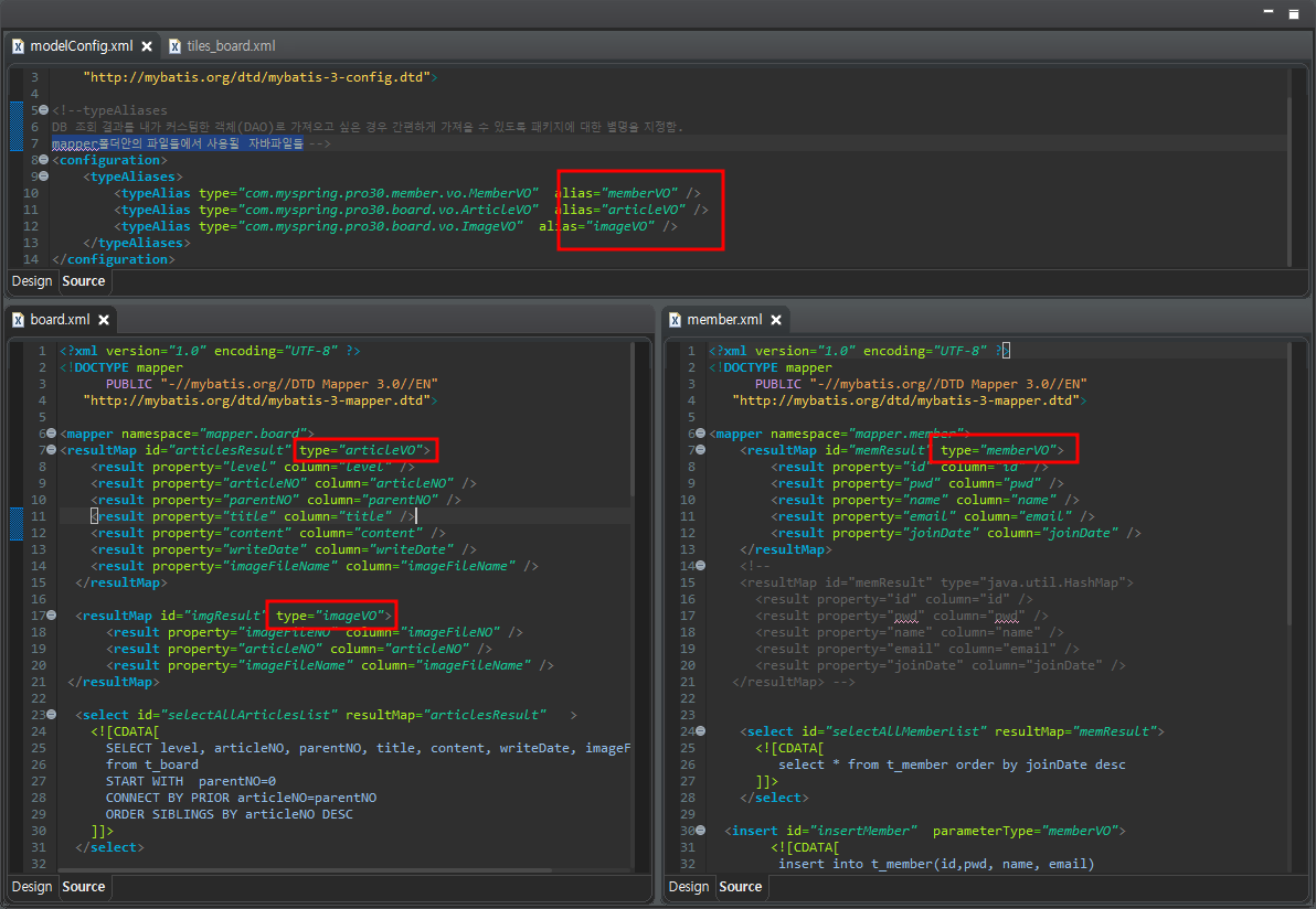위에서 지정된 별명들은 mapper폴더안의 파일들에서 사용됨.