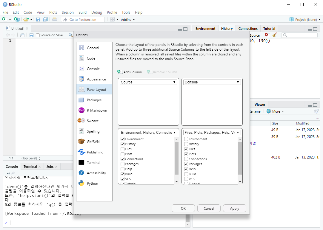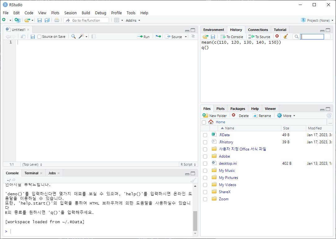 코드입력창 R script: ctrl shift n